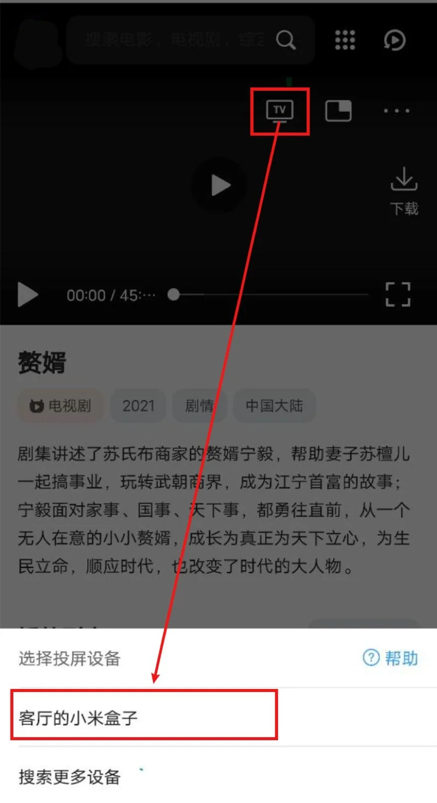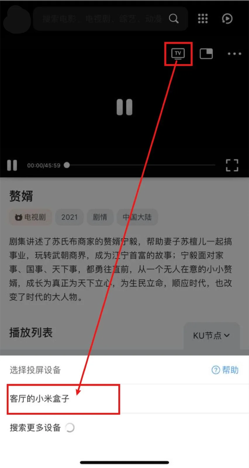 打开QQ浏览器(会接管网页播放器)->打开CY免费视频分享大全 - 中国 - 马来西亚->播放视频->选中投屏图标->等待搜寻出智能电视/电视盒子->选中,即可投屏。
